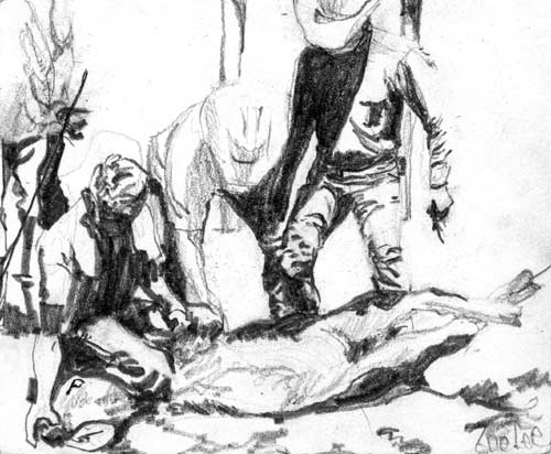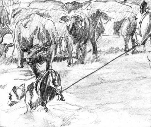 Every spring, all the ranchers would come together to brand the new calves at each ranch strung along the Blue River south of Kremmling, Colorado. All hands were on deck as the calves were roped, wrestled, tagged, inoculated, castrated and branded. The cowboys would laugh at my father for dousing the trash can lid of ‘Rocky Mountain Oysters’ roasting over the branding fire with whiskey to flambé the testicles before eating them. I spent a lot of time in the kitchen with some of the other women, learning how to feed a crowd of hard working men, but I also entered into the corral to do my share of the work in the smoky arena that reeked of charred cowhide. This series of drawings were created years later in memory of the community ranching days to honor the way agrarians help each other out with the large chores that are needed to keep a ranch going.